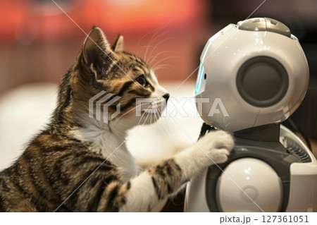A curious cat and a robot, pet and technology concept