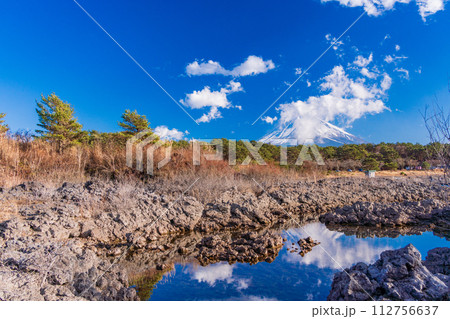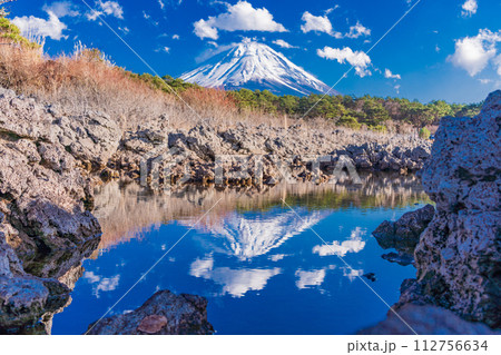 【山梨県】本栖湖 湖畔の溶岩越しに富士山