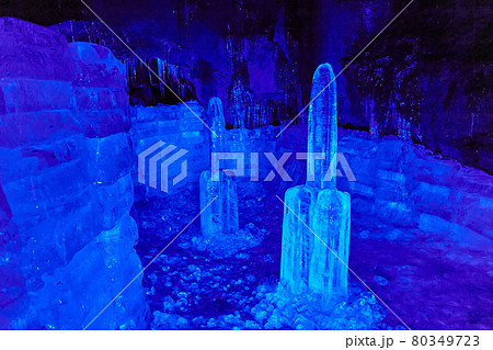 鳴沢氷穴 青くライトアップされた氷 山梨県 鳴沢村