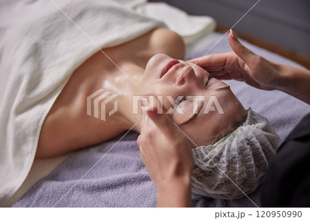 Asian woman in white towel with eyes closed enjoying facial massage at spa salon