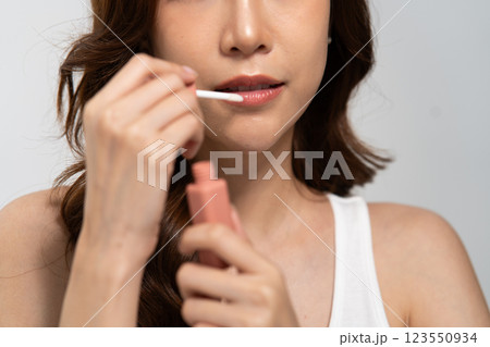 Beauty routine of an Asian woman applying lip gloss for a flawless look during a skincare session