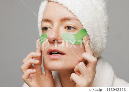 A woman with a towel on her head and a robe smiles as she applies green gel patches under her eyes facial cosmetology concept