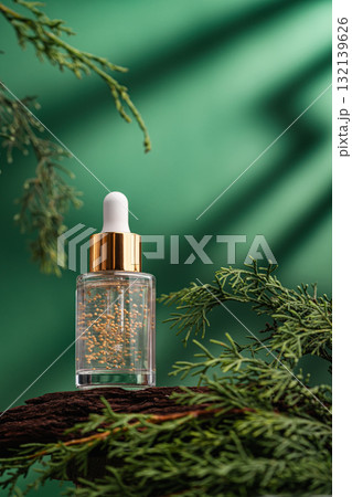 Glass cosmetic serum bottle on natural background with green leaves