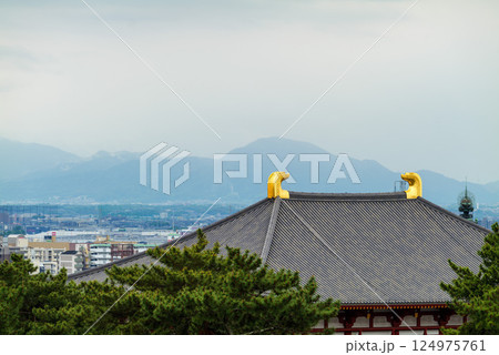 奈良県庁展望台 興福寺中金堂と霧でかすむ二上山 雄岳 2022年4月5日