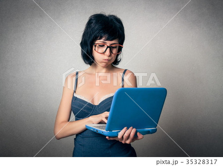 Funny woman using laptop