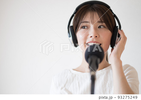 マイクを持ってボーカルレッスン、カラオケやボイストレーニングする女性 習い事や司会などのイメージ