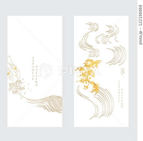 Abstract landscape with Japanese wave pattern vector. Nature art background with Chinese ocean sea and cloud template in oriental style. Hand drawn line.