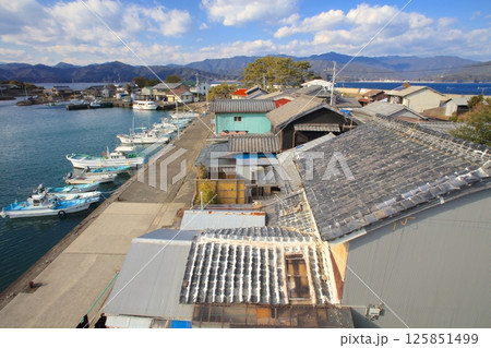 出羽島(てばじま)「重要伝統的建造物群保存地区」にあるタスカルタワーより漁村集落と、遠景に津島や大島