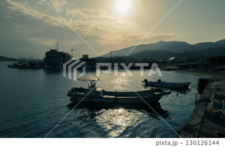 晴れた日の大堂津港に浮かぶ一隻の漁船と大堂津海水浴場