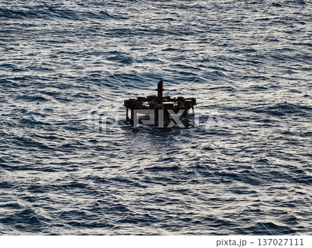Weathered platform amid ocean waves, Nautical survey site with aged metal and ocean backdrop