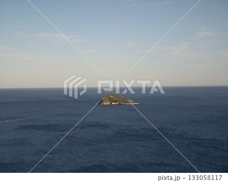 isolated coastal monument, remote solitary island surrounded by peaceful blue waters and clear skies