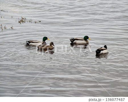 Serene ducks glide across silent waters with symmetrical composition and calming atmosphere