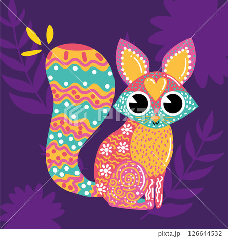 Smiling beckoning cat Maneki neko with raised paw and wealth and luck symbol. Vector illustration