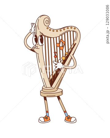 Cartoon groovy harp musical instrument character. Isolated vector plucked, stringed funny personage strumming on itself, playing music and expressing positive emotions with tune notes floating around