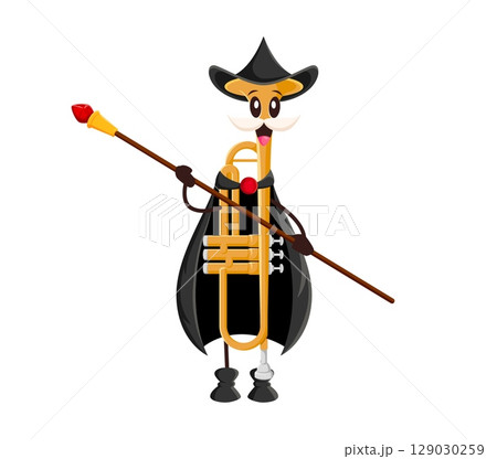 Cartoon trumpet Halloween mage and wizard character, fantasy musical wind instrument wears black witch hat and cape holing magical staff in hands. Isolated vector horn woodwind music pipe personage