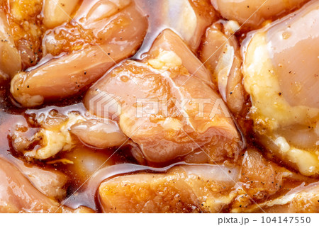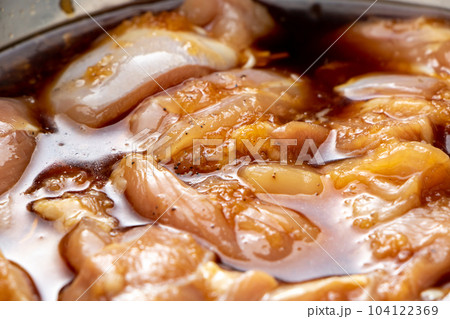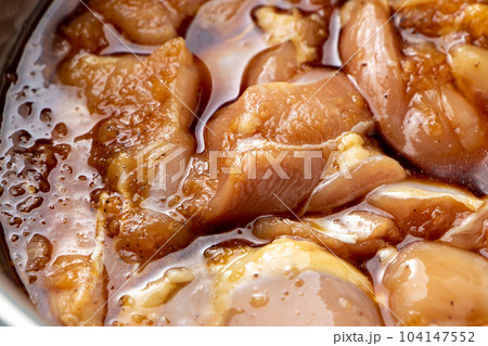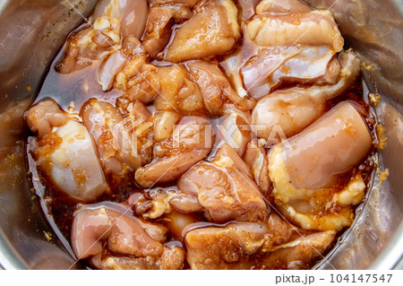 鶏肉の唐揚げ調理シーン。鶏もも肉に下味をつけるため、タレに漬け込む。