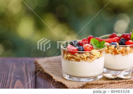 granola with greek yogurt and berries in two glasses