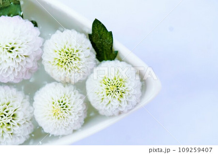 白背景に船型の陶器の器に入った水に浮かべられた白い菊の花のフローティングフラワー