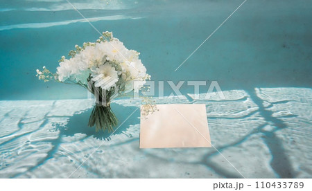 水中の白い花束と手紙、ミステリアスなメッセージカード(AI生成)