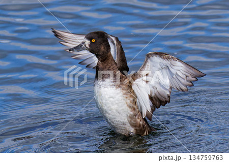 翼を広げるキンクロハジロの雌