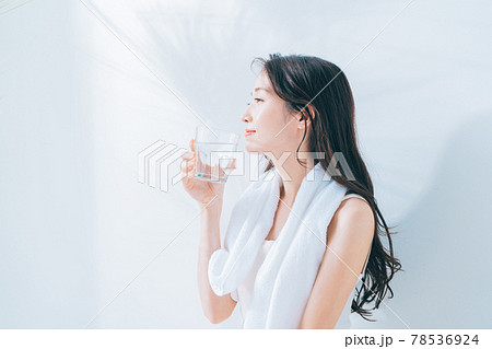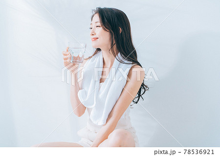 お風呂上がりに水を飲む女性
