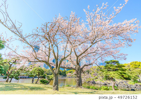 日本の春 浜離宮恩賜庭園の桜と汐留高層ビル群の風景