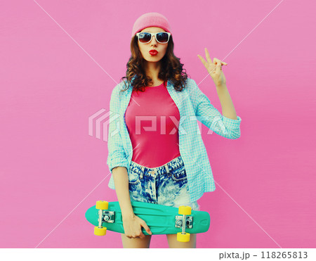 Summer portrait of stylish modern young woman model posing with skateboard in pink on background