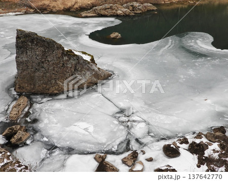 白く凍った王滝川
