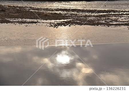 朝の光に輝く川面の水鏡