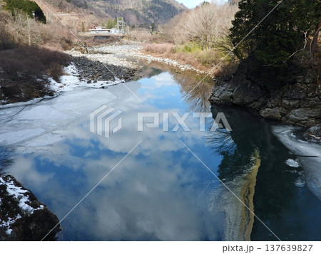 澱み部分が凍結した冬の王滝川