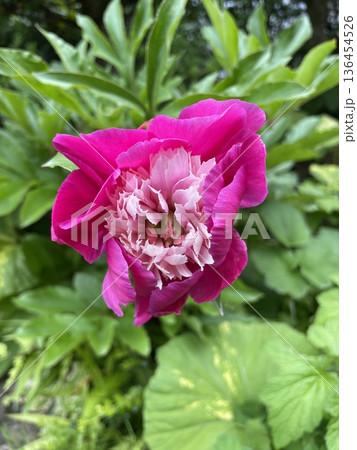 初夏の日差しを浴びて咲き誇る大輪の紅色の牡丹
