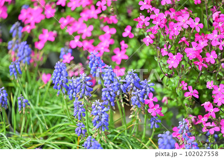 春の濃ピンクの花、芝桜、しばざくら、と紫色のムスカリ。