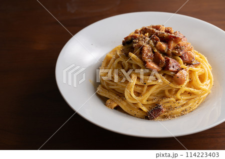 カルボナーラパスタ ベーコン 胡椒 俯瞰