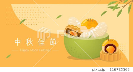 豐富又美味的柚與月餅,中國酥皮與蛋黃甜點,傳統食物,中秋節的向量插畫素材