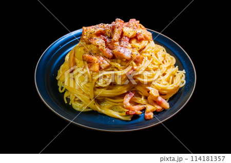 カルボナーラパスタ 卵黄乗せ 黒背景 俯瞰