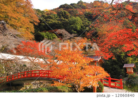 紅葉に囲まれた瀧安寺鳳凰閣と赤い橋。箕面市、大阪