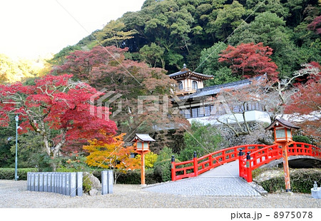 日本 大阪府箕面市の箕面公園にある瀧安寺の客殿と瑞雲橋と紅葉