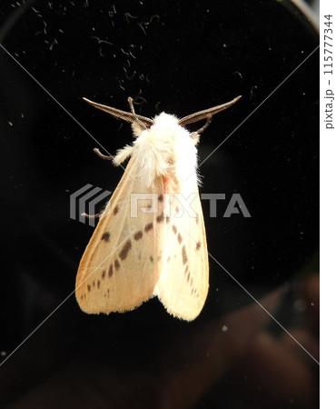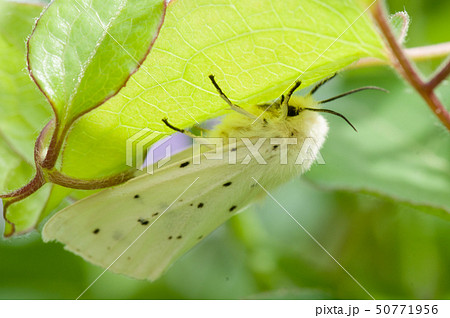 生き物 昆虫 キハラゴマダラヒトリ、白地に黒い斑点のある翅。モフモフの体がかわいい