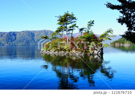 青森県 十和田湖 西湖 御前ケ浜から臨む恵比寿・大黒島 風景、景色、10月、空、晴れ、青空、秋、朝、