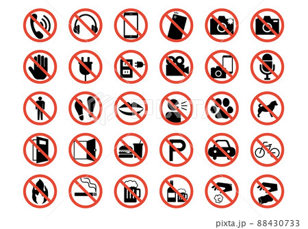 禁止マーク一覧 写真撮影禁止 スマホ禁止 立入禁止など禁止マーク24個セットのイラスト アイコン素材