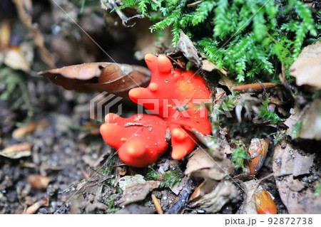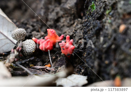 小指の先ほどの大きさの猛毒の赤いキノコ「カエンタケ」(マクロレンズ使用・屋外自然光・接写写真)