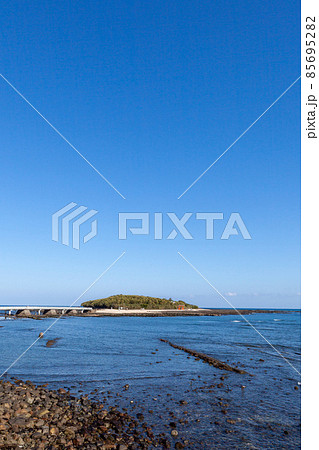 青空の下に隆起海床できた上に貝殻が蓄積しできた島に神様が祀られその周りには、鬼の洗濯岩や侵食さ波状岩