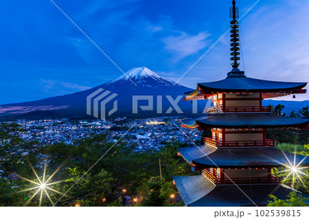 (山梨県)日本の美・新緑の新倉山浅間公園から望む富士山 夕景