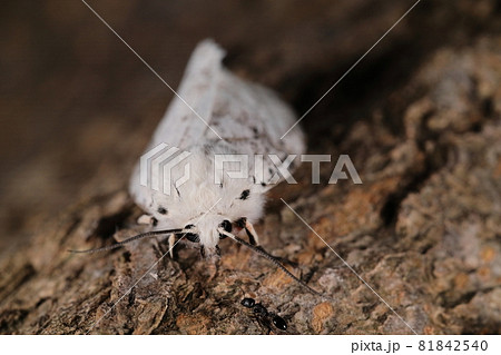 生き物 昆虫 スジモンヒトリ、白地に黒い斑点。隠れた腹背は真っ赤、前胸背が白一色なのは識別点の一つ