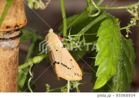 生き物 昆虫 スジモンヒトリ、薄色の翅に黒い斑点が並ぶ。翅に隠れた腹部の背面は紅色