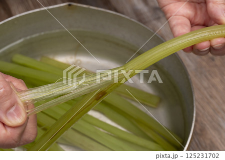 塩で山の蕗のアク抜き