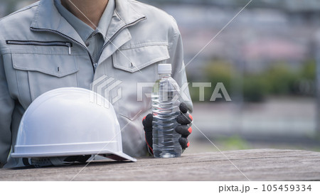 ヘルメットとペットボトルの水|建設業・熱中症対策 イメージ