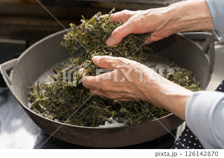 炮烙鍋でお茶の葉を乾燥しているシニア女性