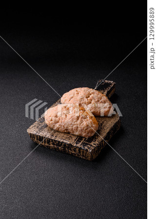 Roast pork tender loin steak, neck meat. wooden background. top view