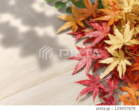 赤やオレンジの落ち葉が点在する木の床背景素材(ナチュラル・秋の雰囲気)